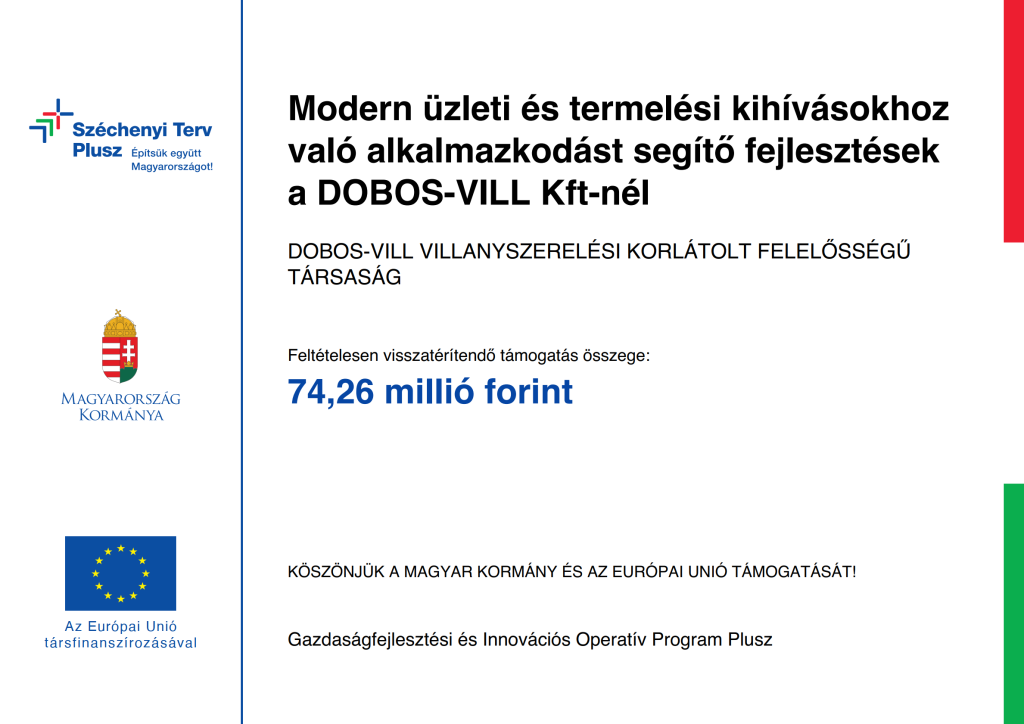 „Modern üzleti és termelési kihívásokhoz való alkalmazkodást segítő fejlesztések a DOBOS-VILL Kft-nél” elnevezésű projekt, melynek megvalósulását 74,26 millió Ft feltételesen visszatérítendő támogatással segíti a Gazdaságfejlesztési és Innovációs Operatív Program Plusz. A forrását az Európai Regionális Fejlesztési Alap és Magyarország költségvetése társfinanszírozásban biztosítja.